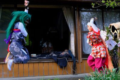 2つの集落の鬼太鼓が門付けしてまわる。舞は能の動きを取り入れた潟上型